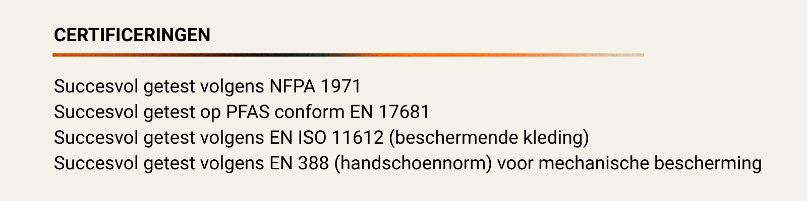 Succesvol getest volgens NFPA 1971, EN ISO 11612, EN 388 en PFAS-testprotocollen en alle evaluaties succesvol doorstaan.